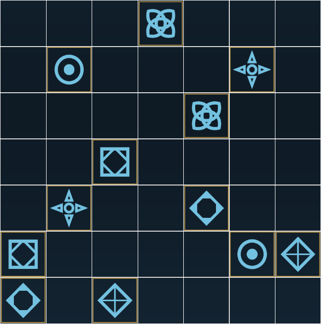 From there, we can solve it as instructed, drawing continuous paths between each paired symbol. It's basically a game of Flow. This gives us the following